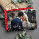 Partagez une photo de mariage préférée ce Noël avec notre carte de vacances joyeusement festive avec "joyeusement toujours après" dans un script de calligraphie moderne blanc et croustillant. Personnalisez avec vos noms et l'année. La carte revient à un motif de neige rouge et blanche en hiver.