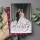 Les cartes photos de vacances élégants pour les jeunes mariés disposent d'une photo mariage préférée verticale ou portrait avec "Merrily Ever After" superposé dans un riche script de calligraphie de prune bordeaux à bijoux. Personnalisez avec vos noms ou salutation personnalisée en dessous. Un subtil et moderne motif de flocon de neige à l'envers complète le look. Parfait pour partager une photo mariage pour votre premier Noël de mariage.