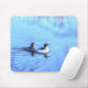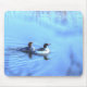 Ein Paar Merganser Enten schwimmen auf einem blauen Teich.