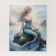 Jigsaw Puzzle einer ruhigen Meerjungfrau mit langen fließenden Haaren, die anmutig auf einem Felsen sitzen, umgeben von ruhigen Meeresgewässern und entfernten Klippen. Weiche Pastellfarben verstärken die ruhige und magische Atmosphäre der Szene.