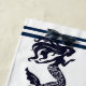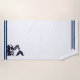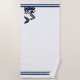 Dieses Strandtuch ist in weißer Farbe mit Meerjungfrau-Aufdruck und gestreiften Akzenten in marineblauer Farbe dargestellt. Passen Sie dieses Objekt an oder kaufen Sie, wie es ist. Bild