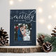 Elegante Urlaubskarten für Neuvermählte bieten ein beliebtes Hochzeitsfest-Foto auf einem reichen dunkelblauen Hintergrund mit "Merrily Ever After" in weißer Kalligraphie. Personalisieren Sie mit Ihren Namen oder benutzerdefinierten Gruß unten. Eine tonale Schneeflocke rundet das Aussehen ab. Ideal, um ein Hochzeitsfest für Ihre ersten verheirateten Weihnachten zu teilen.