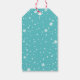 Festive "Merry & Bright" themed Christmas gift tag cards feature a two-sided custom design with border of white stars and snowflakes that you can personalize. The teal / turquoise blue green background color can be customized.