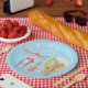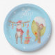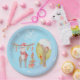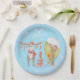 Chris-Moose ist mit einem rot-weiß gestreiften Schal und einer Weihnachtsmannmütze in seiner Feinheit gekleidet. Seine Geweihe sind mit Weihnachtsliedern, Strümpfen und Ziergegenständen geschmückt. Neben ihm ist ein Stapel verpackter Weihnachtsgeschenke. Ein roter Vogel mit einer Weihnachtsmannmütze sitzt in einem Baum neben seinem Vogelhaus. Ein Weihnachtsbaum hängt mit einem bereits darin enthaltenen Geschenk vom Strumpf. Typografie sagt "Oh so fröhlich". Der Hintergrund ist blau mit funkelnden und funkelnden Sternen überall. Das wären wunderschöne Teller für Weihnachten, die mit Freunden und Familie zusammenkommen!