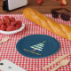 Diese niedliche Papiertafel aus dem Merry Chrismukkah-Party besticht durch einen grünen Weihnachtsbaum, der mit blauen dreieligen Ornamenten geschmückt ist, und einen goldenen Jüdischen David-Stern an der Spitze für Hanukkah, der die beiden Ferien für eine Familie vereint, die beide feiert.