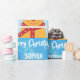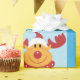 Moderne Weihnachtsgeschenkverpackung für Kinder, mit Rudolph dem Rentier, dem Gruß "Frohe Weihnachten" in stilvoller Typografie und einem personalisierten Namen. Auf blauem Hintergrund mit Schneeflocken.