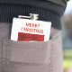 Merry Christmas text can be customized by you. Photo of a plastic skull wearing a Santa hat on a red background.