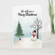 The holiday card shows a cozy winter scene with a snowman 🎅🏼 wearing a red scarf and black hat. He has a big smile 😊 and looks like he's waving hello. There are trees with red berries 🎄 and a blue sky. The card says "We wish you a Merry Christmas" in fancy letters at the top. Everything looks peaceful and happy, like a calm winter day. It's a perfect card to spread holiday joy and cheer 🎁.