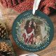 Eleganter und festlicher Kranz-Schmuck aus dem Weihnachtsfest mit unserem handbemalten Aquarellkranz. Mit zwei Fotos, eines auf jeder Seite des Ornaments. Der Hintergrund ist mit einem leichten, goldenen Champagner-Streifen dekoriert. Personalisieren Sie mit zwei Fotos, Familienunterschrift und Jahr. Handgezeichnet Kunstwerk von Moodthology Papery.
