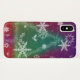 Weiße Schneeflocken, heilige Blätter, Beeren, Sterne und Kiefernbäume vor einem leuchtenden Hintergrund aus Rot, Orange, Gold und lila, mit einer weichen grünen Weihnachtsbaumform in der Mitte.