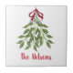 Fröhlicher Mistletoe mit weißen Beeren, die in einem roten Band befestigt sind, schmiedet über einer Tür und wartet auf die Unterlegenen. Ein schönes und einfaches Design, das ein einfaches und klassisches Weihnachtselement darstellt. Ein wunderschönes Design für jeden Anlass.