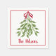 Fröhlicher Mistletoe mit weißen Beeren, die in einem roten Band befestigt sind, schmiedet über einer Tür und wartet auf die Unterlegenen. Ein schönes und einfaches Design, das ein einfaches und klassisches Weihnachtselement darstellt. Ein wunderschönes Design für jeden Anlass.