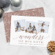 Elégant carte photo religieux de vacances présente trois photos de carré dans un plan de collage, avec "des merveilles de son amour" superposées dans un script de couleur terre douce et des lettres de bloc. Personnalisez avec votre ou vos nom(s) et l'année en dessous. Les cartes renversent vers un arrière - plan à motifs botaniques rouge et crème. Un choix moderne et minimaliste pour vos salutations de Noël 2021.