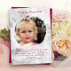 Dites merci à la fille aux fleurs avec une jolie carte contenant sa photo ! Arrière - plan floral blanc, avec texte rouge vin foncé et un exemple de message. Sa photo est en brosse, cadre rond, ce qui rend les bords irréguliers. Ajoutez une photo mariage de la Flower Girl. L'inverse est du vin solide rouge. Modifiez les couleurs à l'aide de l'outil de conception.