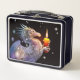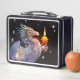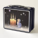 Eine schwarze Metal-Lunchbox mit Zeichnungen von glücklichen Drachen, die Kerzen bewundern, von Melody Pena.