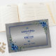 Metallic Silver, Dreams of Blue Gästebuch Dieses Gästebuch ist ein Meisterwerk des Designs, mit seinen silberfarbenen Metallic-Stilelementen und auffallenden blauen Blumenmotiven, was es zu einem gepflegten Sake für die nächsten Jahre macht.