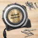 Mesure de ruban moderne pour votre construction, entrepreneur, remodelage, design d'intérieur, immobilier ou toute autre entreprise avec votre nom dans une grande typographie en gras sur un arrière - plan en faux métal en or brossé. Ajoutez deux lignes de texte, comme votre titre d'entreprise, votre slogan ou vos coordonnées.