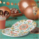 These bachelorette party plates have a floral talavera style tile design. Colors include blue, yellow, pink, white and coral.
