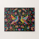 Genießen Sie dieses einzigartige mexikanische Otomi Jigsaw Puzzle! Es verfügt über eine mexikanische Otomi Print mit Vögeln und Blume in lebendigen, hellen Farben...auf einem schwarzen Hintergrund!