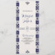 Dieses Design des mexikanischen Talavera Majolica Navy Blue White Wedding Programms zeigt eine hohe vertikale Anordnung mit einem weichen cremefarbenen Hintergrund gerahmt durch symmetrische marineblau gemusterte Fliesen an beiden Seiten. Die Fliesen, die von den traditionellen Talavera- oder Majolica-Designs inspiriert werden, zeichnen sich durch eine Vielzahl verzierter Motive aus, darunter Blumen, Wirbel und geometrische Elemente, die eine reiche, traditionelle, aber zeitlose Ästhetik schaffen. Die minimalen dekorativen Akzente werden oben und unten im zentralen Bereich platziert, wodurch der längliche Mittelbereich offen verlassen wird und ideal für Text- oder Veranstaltungsdetails ist.