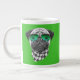 Das Design ist mit einem Portrait Mops mit Sonnenbrille und einem schwarz-weißen Schal ausgestattet.