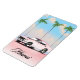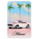 Miami Pink Sunset Reiseplakat mit einem retroamerikanischen Muskelauto gegen einen Sonnenuntergang im Abend.