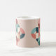 This Morphing Mug features a geometric art piece featuring overlapping circles and curved shapes in a symmetrical pattern. The color palette consists of coral pink, teal blue, navy blue, cream white and light salmon tones. The design is arranged in a four-pointed star formation, with curved shapes creating a balanced composition on a beige background. The shapes are arranged in a way that creates negative space and visual flow, with some circles partially overlapping others. The curved segments are arranged in a continuous, flowing pattern that creates a modern, abstract aesthetic. The image is on both sides of the mug. When you put a hot drink in the mug the image will appear.