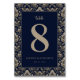 This is a sophisticated style image featuring an elegant table number card with a rich navy blue background and intricate gold floral patterns along the borders. The large, stylish number "8" in a soft beige tone stands out prominently, accompanied by the names "Lauren & Benjamin" and the date "May 23, 2026," all elegantly scripted in white. It exudes a sense of timeless elegance and refinement, perfect for adding a touch of class to any wedding or formal event setting.