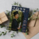 Elegante Rose Gold Abschluss Einladung in dunkelblau personalisiert mit einem Foto auf dem Cover und drei weitere Foto auf der Rückseite. Doppelseitige Abschluss-Einladung mit Goldfolie der Rose auf einem dunkelblauen Hintergrund mit Foto des Absolventen in Bogenform und einem hübschen Rose Goldpfeil bedruckt. Abschluss Einladung personalisiert mit Fotos und den Namen des Absolventen in Rose Goldfolie.