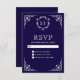 Elegante RSVP-Karte mit einem verzierten, eleganten Rahmen und schönem Monogramm vor dunkelblauem Hintergrund.