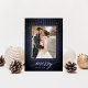 Élégant carte photo de vacances dispose d'un arrière - plan bleu nuit richement texturé, orné de délicates guirlandes blanches et lumineuses au sommet. Ajoutez votre photo verticale ou portrait préférée encadrée par une bordure blanche. "Merry" apparaît en bas dans le script de calligraphie blanche en lettres, avec votre nom de famille caché dans le design. Personnalisez le dos avec trois photos supplémentaires et un accueil de Noël personnalisé.