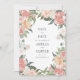 Notre Floral de mi-été enregistrer la carte de date encadre vos principaux détails mariages, y compris la date et l'emplacement, à l'intérieur d'une bordure fleurie luxuriante de roses et de pivoines en rose roux, crème et pêche. Personnalisez avec vos noms, votre date de mariage et votre emplacement à l'aide des champs fournis. Les cartes retournent à un arrière - plan de lavage à l'aquarelle subtil en vert sauge clair.