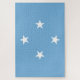 Dieses Design zeichnet sich durch die Flagge der Föderierten Staaten von Mikronesien (FSM) aus, oder einfach Mikronesien, ein Inselstaat in Ozeanien. Die Federated Staaten of Micronesia bestehen aus vier Staaten (von West nach Ost, Yap, Chuuk, Pohnpei und Kosrae), die sich über den Western-Pazifik verteilen. Sie liegen nordöstlich von Indonesien und der Papua-Neuen Guinea, südlich von Guam und den Marianen, westlich von Nauru und den Marshallinseln, östlich von Palau und den Philippinen, knapp 4.000 Meilen nördlich von Ost-Australien, knapp über 2.000 Meilen südöstlich von Japan und etwa 4.500 Meilen südwestlich der wichtigsten Hawaiianer Inseln. Die Federated Staaten of Micronesia sind auf einen Teil der Caroline Islands in der weiteren Region Mikronesiens verteilt, die aus Tausenden kleiner Inseln besteht, die auf mehrere Länder aufgeteilt sind. Der Begriff Mikronesien kann sich auf die Federated Staaten oder auf die Region als Ganzes beziehen. Der hellblaue Hintergrund der Fahne repräsentiert den Pazifischen Ozean, während die vier Sterne die Staaten in der Föderation darstellen: Chuuk, Pohnpei, Kosrae und Yap.