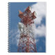 Ein roter und weißer Mikrowellenturm für den Mikrowellenfunkdienst steht hinter einem blauen Himmel und wüsten weißen Wolken auf dem Land. Sobald diese Türme von den Telefongesellschaften für die Weiterleitung von Ferngesprächen genutzt werden, können sie neuere Telekommunikationstechnologien wie Mobiltelefone und drahtlose Internetdienstanbieter unterstützen.