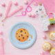 Milch & Cookies Für den Liebhaber von Schokoladenkeksen in der Familie. Feiern Sie Ihren kleinen Geburtstag mit unseren lustigen und festlichen Keksen und dem Thema Milch. Mit einem großen Glas Milch mit einem Schlackenstrohdach und Schokoladenkeksen. Der Hintergrund ist in hellblau mit festlichen bunting Fahnen. Vollständig anpassbar. Karo der koordinierenden Schreibwaren und Geschenke.