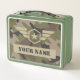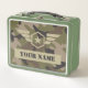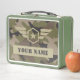 Lunchbox im militärischen Stil mit Tarnuntergrund und Weltraum, die militärische Symbole imitiert, um den Namen zu setzen