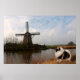 Ein gut aussehender Keeshond stellte sich vor einer Windmühle und einem Kanal in seinem Heimatland Holland.