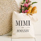 Diese minimalistische Totentasche, die eine schicke Oma feiert, zeichnet sich durch eine minimalistische Tasche aus, die "Mimi" oder Ihre Wahl von Oma-Spitznamen in schwarzen Serifenschrift auszeichnet. Mit dem Jahr, in dem sie zu einer Großmutter wurde, in eleganten römischen Ziffern für eine schicke Touch.