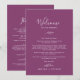 Diese minimalen Blätterbeeren Begrüßungsbriefe & Reisekarten sind perfekt für eine Hochzeit. Die Silhouette ist schlicht und besteht aus einem grünen Blatt in romantischer, violetter Sommerfarbe mit minimalistischem böhmischen Gartenstil. Auf der Vorderseite der Karte befindet sich ein Begrüßungsschreiben, auf der Rückseite der Karte befindet sich der Hochzeitstag. Diese Noten sind ideal für Hochzeiten in Urlaubsort und Begrüßungstaschen für Hotelgäste.