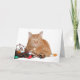 Orangefarbene Tischkatze legt Weihnachtsdekorationen an und behauptet sie als seine eigene Weihnachtsgrußkarte für das Foto