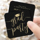 Ces invitations à la remise des diplômes sont de petite taille mais grandes sur la simplicité stylisée. Annoncez la réussite du diplômé et la famille et les amis invitations à célébrer avec d'élégantes mini cartes d'encaissement de la fête de remise des diplômes. La petite taille du carte de visite carré les rend faciles à insérer avec les annonces de remise de diplômes ou à distribuer à la famille et aux amis (ils ne sont pas fournis avec des enveloppes.) Vendu en paquets à un prix abordable, ces inserts offrent une option chic pour rester dans un budget raisonnable. Le libellé de ce modèle est simple à personnaliser, et les couleurs peuvent être customisées à l'aide de l'outil de design Zazzle. Le design moderne en noir et or présente une calligraphie manuscrite avec un casquette en carton de mortier et une élégante typographie classique. Veuillez noter que l'or est imprimé en couleur et non en métal. Cette carte d'invitation à l'obtention d'un diplôme est une façon unique d'annoncer une fête spéciale. Félicitations au diplômé !