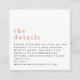 MINI QR Code Terracotta Wedding Details. Eine charmante Miniatur Größe 2.5" Quadrat, um mit Ihren Einladungen mit Ihrem Qr-Code auf Ihrer Hochzeitswebsite auf der Rückseite. Die Kopfzeile ist groß und in stilvollen Kleinbuchstaben in Terrakotta mit den Details darunter und viel weißer Platz auf einer quadratischen Form für einen zeitgenössischen Stil. Personalisieren Sie den Text einfach auf Ihre eigenen Daten und ersetzen Sie den QR-Code durch Ihren eigenen. So erstellen Sie eine QR-Code-Suche online "generieren QR-Code"