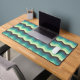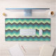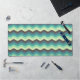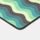 Diese Tischmatte zeichnet sich durch ein durchgängiges Muster aus wellenförmigen, waagerechten Linien aus, die sich in sanften Minzgrün-, aquamarin- und Holzkohletönen wechseln. Die regelmäßigen, welligen Wellen erzeugen einen visuell beruhigenden Effekt, der oft mit Retro oder modernem minimalistischem Design assoziiert wird. Es ist ein Beispiel für ein geometrisches, abstraktes Muster, das an das Rippen von Wasser oder Schallwellen erinnert.