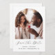 Diese schlichte, minimalistische Save the Date Karte verfügt über einen Boho-Foto-Bogen über den Worten "Save the Date" in eleganter schwarzer Schrift, gefolgt von den Namen der Ehepaare, Hochzeitstag und Stadt in serifenlosen Sans-Schriftart auf weißem Hintergrund. Fügen Sie eine detailliertere Nachricht mit weiteren Informationen auf der Rückseite hinzu.