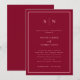 Diese eleganten, modernen und farbenfrohen Einladungen zum Abendessen mit Hochzeitsfeier sind mit einem schlichten bordeauxroten und hellrosa, minimalistischen Textdesign und einem klassischen Rahmen an der Grenze ausgestattet. Fügen Sie Ihre Initialen oder Monogramme hinzu, um sie komplett zu Ihrem eigenen zu machen.