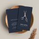 Elegante, individuell anpassbare Visitenkartenvorlage mit IMITATEN Metallschere und dunkelblauem Hintergrund. Perfekt für Haarstylisten, Friseursalons.