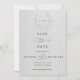 Minimal faux blind deboss cotton save the date card featuring a delicate printed deboss wreath effect and editable text via Template Objects in the Zazzle editor.
