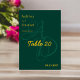 Die elegante Tischnummer in Grün und Gold eignet sich ideal für eine Hochzeit mit modernem Ambiente, das schlichte Design zeichnet sich durch eine elegante Goldkalligraphie auf grünem Hintergrund aus.