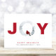 Minimal moderne, naturlich inspirierte Weihnachtsgrüßkarte mit dem Wort "JOY" in großer roter Blocktypografie mit dem "O", dargestellt durch eine Aquarellbilder von schneebedeckten Kiefern und einem Roten Kardinal-Vogel, der innen steht. Sie können den "Happy Holidays" Gruß personalisieren, indem Sie einfache rote Typografie und Ihren Namen und das Jahr darunter koordinieren.