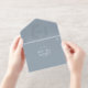 Dieses minimale Blatt staubblauen und silbernen Folie modernen boho Hochzeit alles in einer Einladung ist perfekt für eine elegante Hochzeit. Die Silhouette ist schlicht und grün in hellblau mit klassischem minimalistischem Stil. Auf der Vorderseite der Einladung wird der Monogramm-Kranz, Ihre Initialen und Ihre Namen mit Silberfolie bedruckt. Schreiben Sie Ihre Gastadressen auf der Rückseite der gefalteten Einladung, oder kaufen Sie die passenden Gästetiketten-Aufkleber (separat erhältlich).